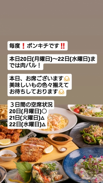 毎度❗ポンキチです‼️本日13日(月曜日)〜15日(水曜日)までは肉バル!お席空いておりま〜す🙇3日...
