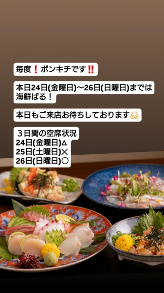 毎度❗ポンキチです‼️本日24日(金曜日)〜26日(日曜日)までは海鮮ばる!本日もご来店お待ちしております...