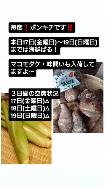 毎度❗ポンキチです‼️本日17日(金曜日)〜19日(日曜日)までは海鮮ばる!マコモダケ・味間いも入荷してます...